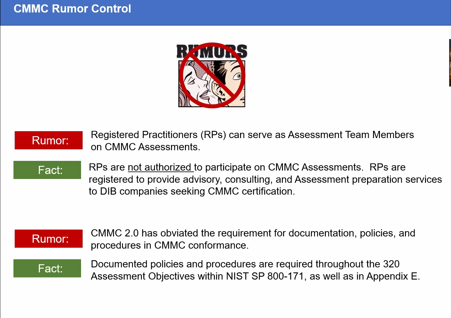 In the CMMC-AB Town Hall from January 25, 2022, CEO Matt Travis dispelled a rumor that CMMC 2.0 does not require written policies and procedures.  He first references Appendix E on a slide titled "CMMC Rumor Control".
