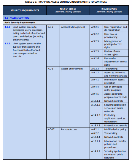 In this example, NIST derived 3.1.1 from FIPS 200. The SP 800-53 Rev 5 mapping indicates these objectives map to more than one control and more than one family. The Rev 3 crosswalk reveals that half the objectives map to the access control family. The other half maps to requirements within the identification and authentication family.