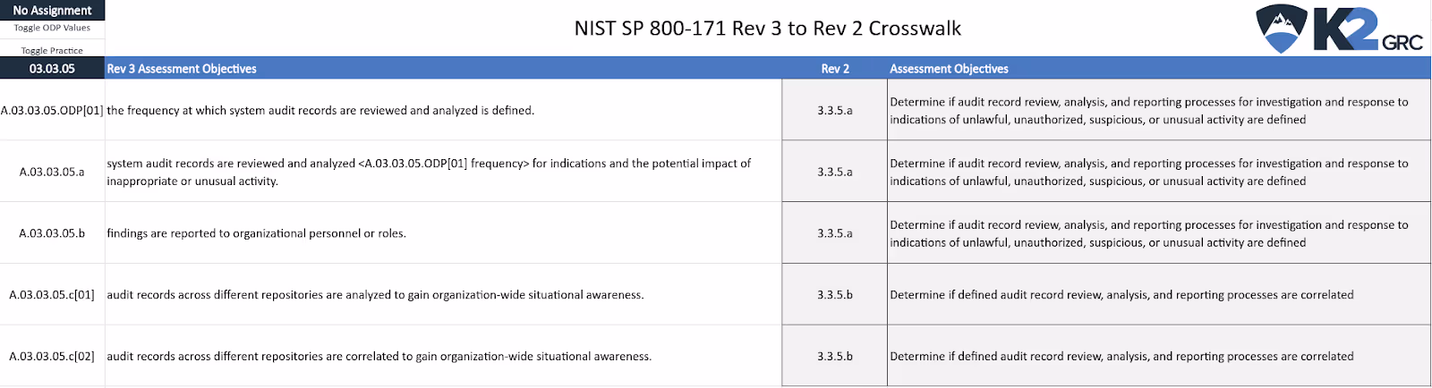 In this example, NIST derived 3.3.5 from AU-6(3) within NIST SP 800-53 Rev 4. The SP 800-53 Rev 5 mapping indicates that part (a) maps to part of the base control from AU-6. Part (b) maps to the control enhancement AU-6(3). The Rev 3 crosswalk confirms this mapping.