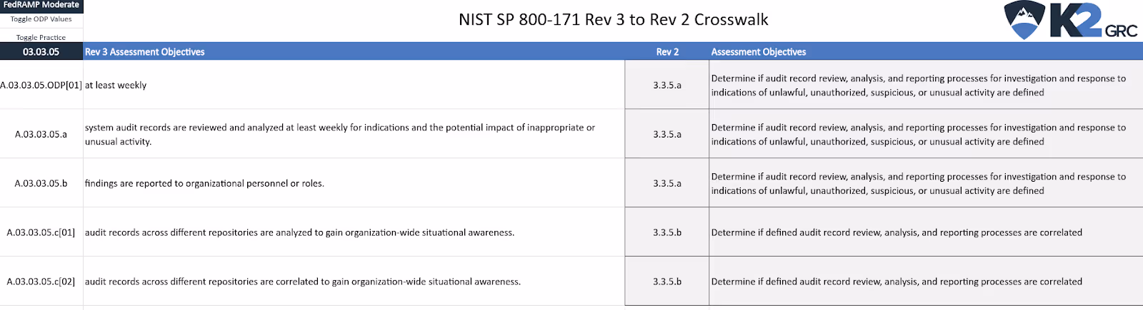 We’ll use the previous example of 03.03.05 from SP 800-171. Using the drop down in Cell A1 we selected the FedRAMP Moderate baseline. If FedRAMP defines the same ODP found in SP 800-171 Rev 3, then the value appears next to the ODP. The displayed text also updates to incorporate this value.
