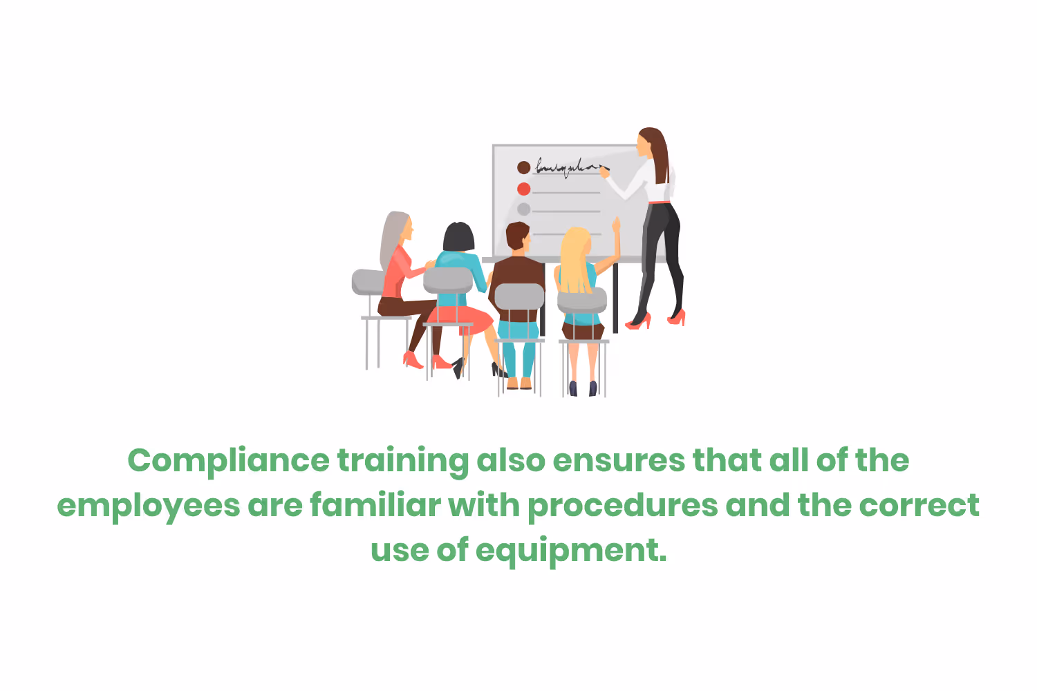 Compliance training also ensures that all of the employees are familiar with procedures and the correct use of equipment. Having this knowledge helps employees reduce any accidents that may happen if an employee is unfamiliar with the equipment.