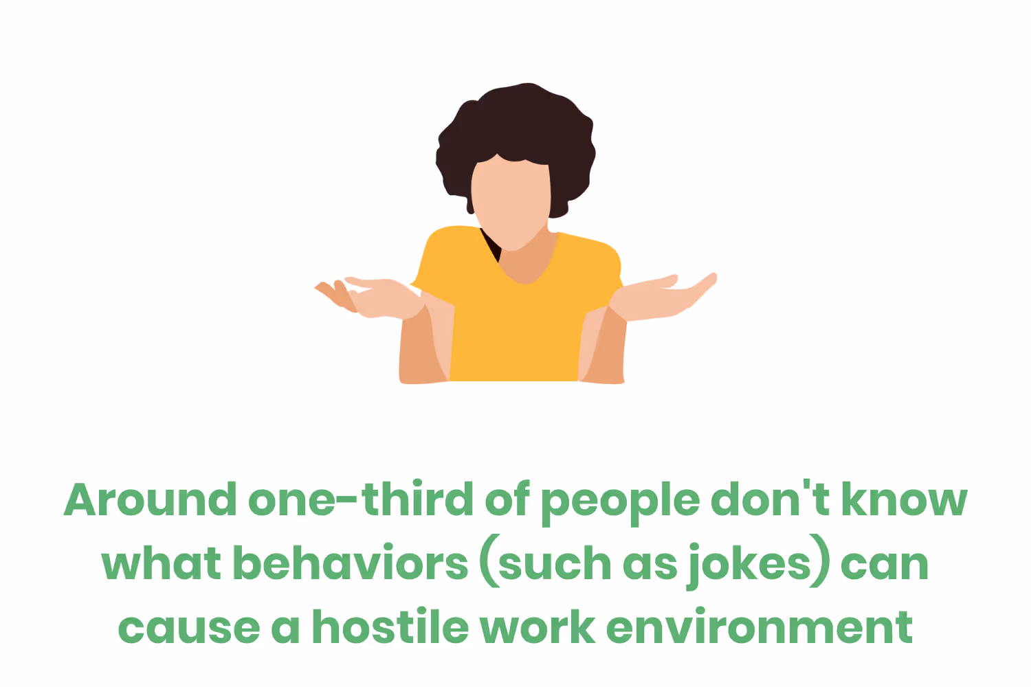 But surprisingly, not everyone knows what constitutes workplace harassment. 34% of workers are unsure about what behaviors create a hostile environment. And 32% were unaware that jokes qualify as harassment.