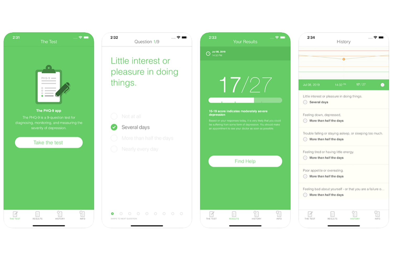 This is the most common mental health questionnaire used among professionals. Users screen for depression, gauge their severity, keep track of their mood and access resources from within the app. It’s possible to store the test results for tracking improvements over time.