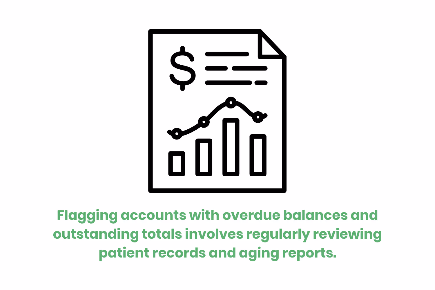 First, identify any overdue accounts. Flagging accounts with overdue balances and outstanding totals involves regularly reviewing patient records and aging reports. You should have a process to be periodically looking over your financial statements to determine which accounts need follow-up on. If you don’t, consider making this a priority from now on.