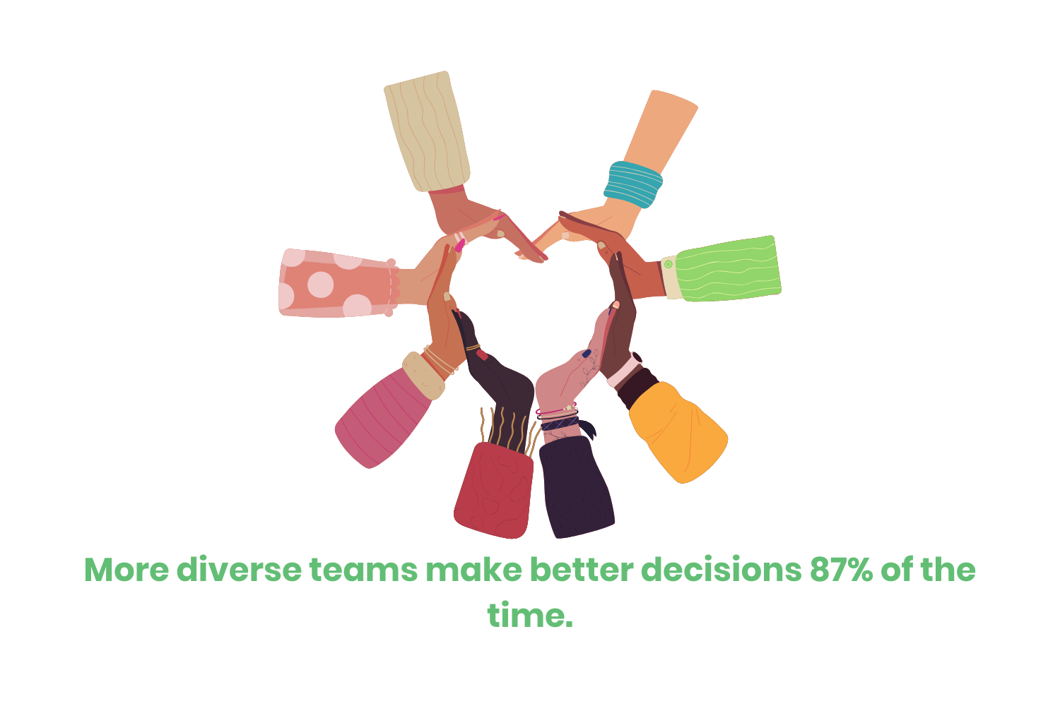 According to Cloverpop, more diverse teams make better decisions 87% of the time. The word “diverse” in this case refers to age, gender, and geographic diversity.