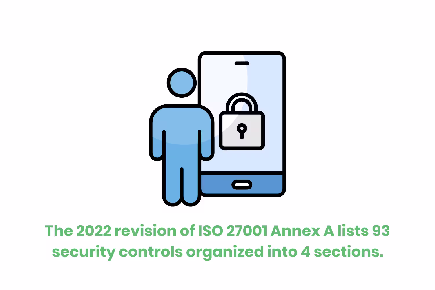 The criteria comes from The 2022 revision of ISO 27001 Annex A, which lists 93 controls. Organized into 4 sections numbered A.5 through A.8. A statement of applicability (SoA) states which ISO 27001 controls are in place, in accordance with the Annex A control set. Let's go over these safeguards briefly with examples included.